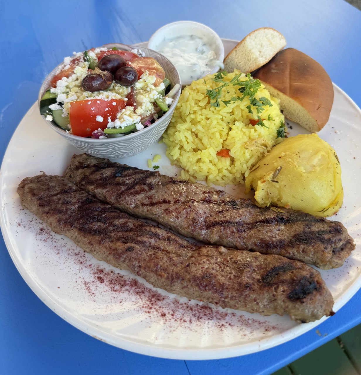 All souvlakis are served with rice, Greek salad, roasted potatoes, tzatziki and pita b bread